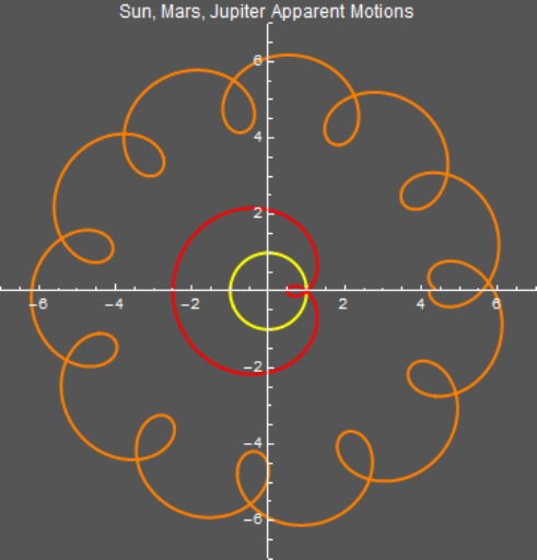 Apparent motions (orbits) of Sun, Mars and Jupiter in Apollonius-Ptolemaic system