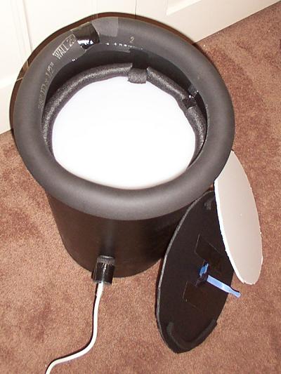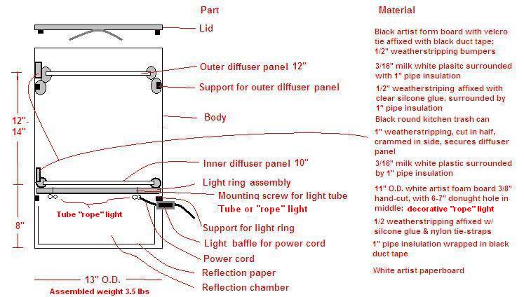 This design differs from the Berry and Burnell light box in that it has two diffuser plates. The Berry and Burnell design has one diffuser plate. The key component of the Berry-Burnell design is a baffled-rear-ward light source that projects into a reflective chamber. This assures a uniform shadowless light. Another key material are milk white plastic diffuser plates. The milk-white plastic plates shown here cost $22US, including cutting-costs, and can purchased from companies in the telephone book under the category "Plastics - Rods, Tubes, Sheets, Etc." Materials costs for this prototype came in at around $75US (trash can $15; rope light $15; milk plastic $22; glue, weatherstripping and pipe insulation $13; foam board and artist paper $10).