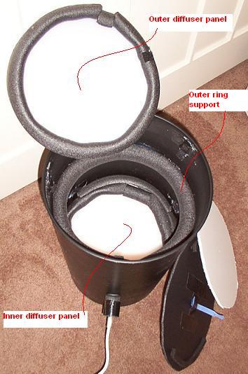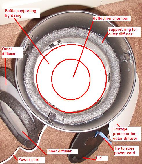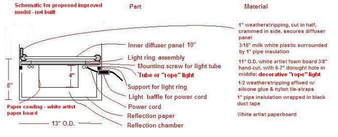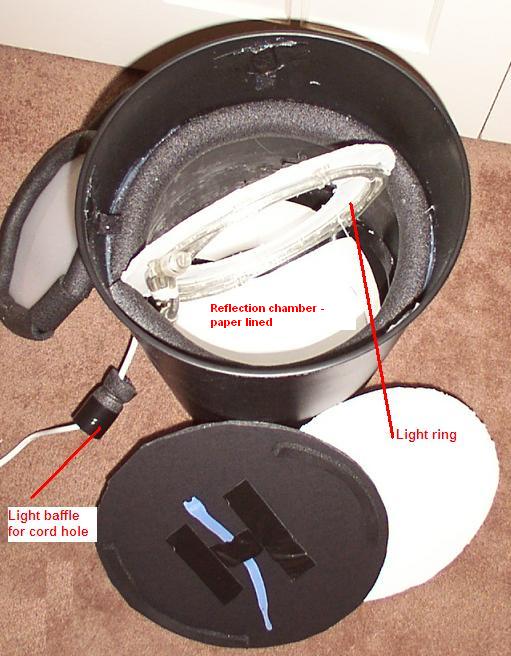 A smaller version of the trash can light box is suggested using only one-diffuser plate and a reflective cowling that is closer to the original Berry and Burnell design. A key difference over this initial prototype is the use of a reflective cowling or baffle around the doughnut-hole of the light-ring. Similar baffles were part of the original Berry-Burnell design.