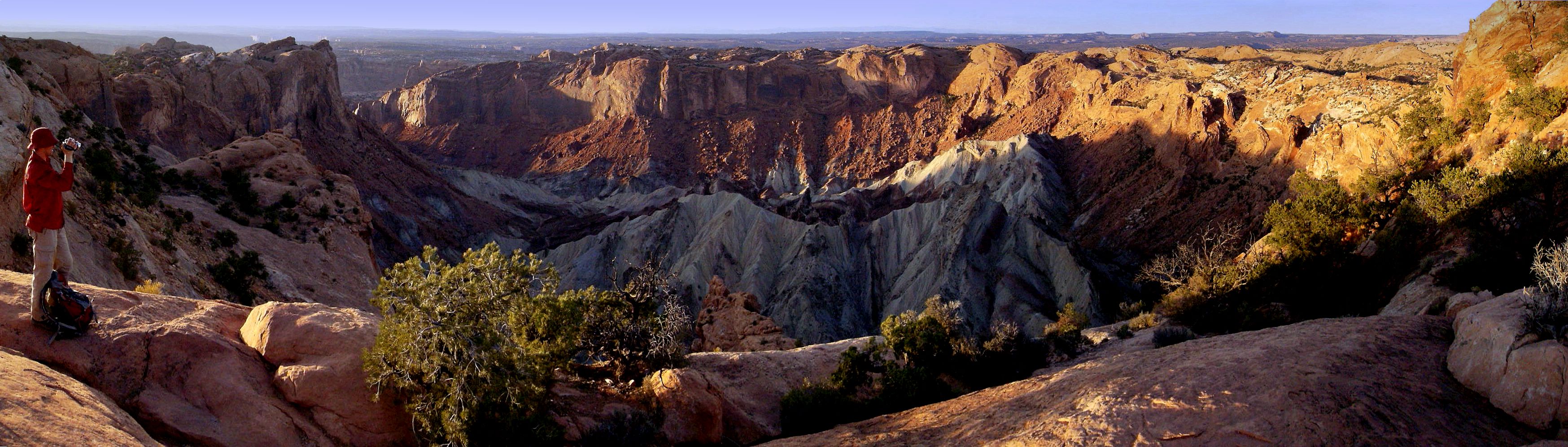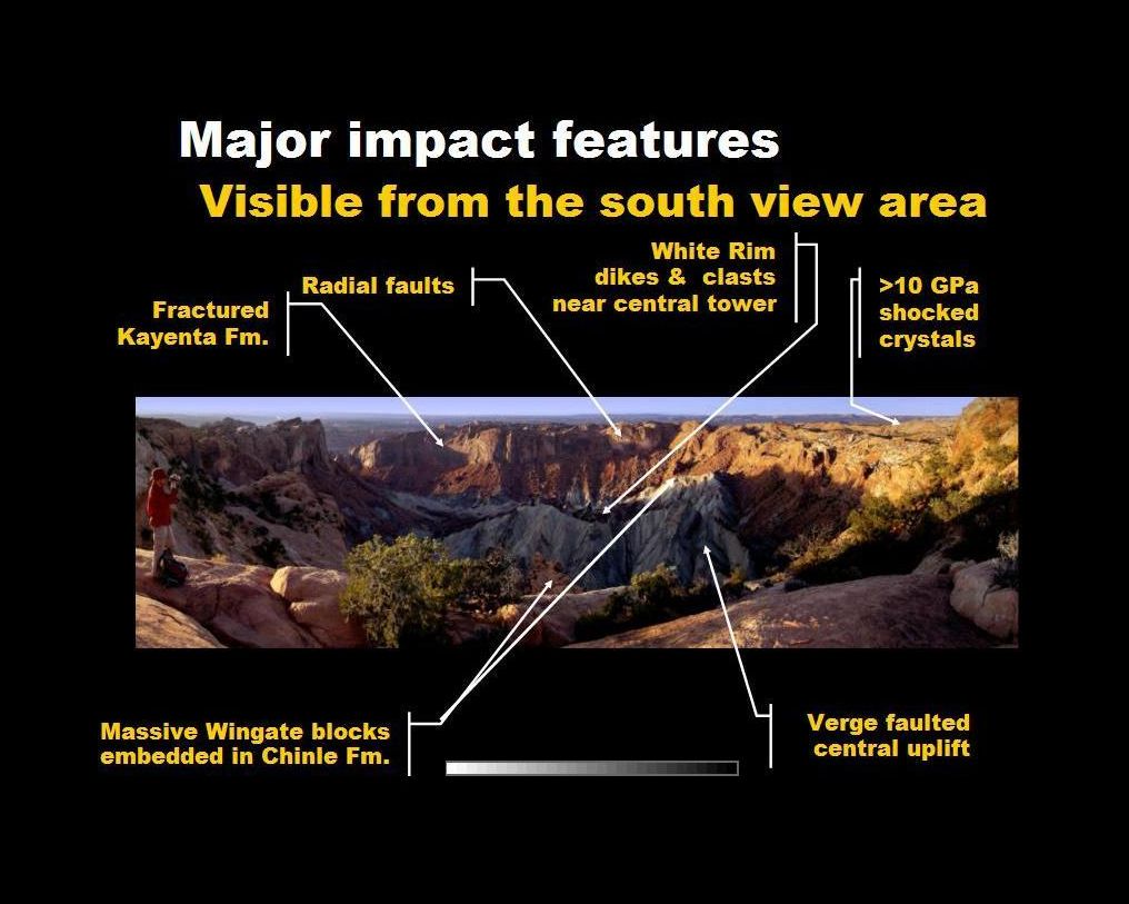 In March 2008, Thomas Kenkmann, a geologist with Humboldt University in Berlin (after six years of research), and Elmar Buchner of the University of Stugggart, provided conclusive evidence that the Upheaval Dome, an impact-shaped feature in Canyonlands National Park, Utah, was caused by a meteor strike. Buchner and Kenkmann located planar deformation features (PDFs) in quartz crystals embedded in the outer sandstone ring of this two ring crater. PDFs are microscopic fractures in quartz crystals that correlate with the intensity of a shock impact experienced by the cyrstal. These PDFs evidence a shock wave greater than 10 gigapascals travelled through Upheaval's sandstone outer ring, unambigously showing a shock generated wave of non-terresterial origin. The feature that we see today is not the original 170 million year old impact crater. The original crater was around 8 kilometers in diameter and extended between 1 and 2 kilometers above the south rim view area shown here. 155 million years ago, Upheaval Dome probably looked something like the 4 kilometer diameter Steinheim Basin in Bavaria, or the 2.5 kilometer blown-sand filled Roter Kamm Crater in Nambia. Subsequent uplift and erosion removed this overburden, leaving this unique 3 kilometer diameter dissection of what the geologic layers might look like at or beneath the surface of an analogous lunar complex crater such as Triesnecker. Several traces of the impact are seen in rock from the south rim view area: a fractured Kayenta layer, radial faults in the inner ring wall, 30 meter tall displaced blocks, verge or circular faulting in the central uplift and melted sandstone dikes near the impact center.