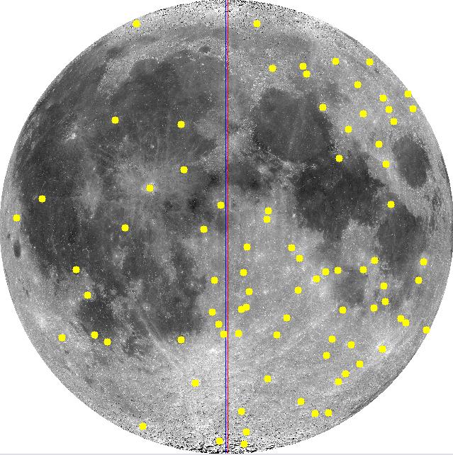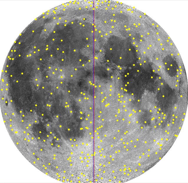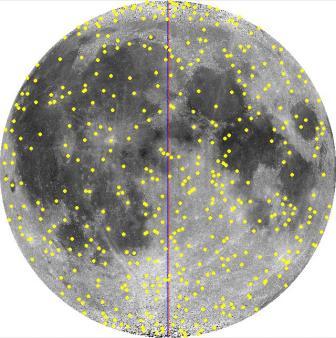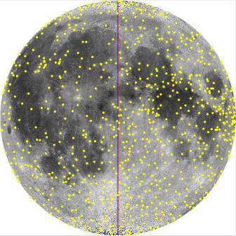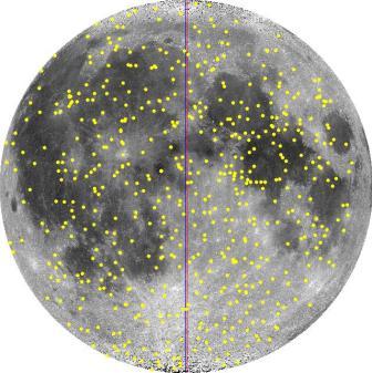 The best standard reference source for larger named crater depths and diameters is the Appendix in Dr. John Westfall's 2000 classic Atlas of the Lunar Terminator. An Appendix to the Atlas reports approximately 830 crater diameters and depths for named large nearside craters. Unlike Arthur (1974) who focused on small craters, Westfall (2000) focuses on large craters. A partial digitization of the crater catalogue in John E. Westfall's Atlas of the Lunar Terminator, Cambridge Univ. Press (2000) is provided here, with the author's permission as to this non-commercial purpose, limited internet distribution. The full catalogue can be found in his book that is available at libraries and on Amazon.com. Westfall's (2000) Appendix is a subset of his 7,000 plus personal unpublished nearside crater database. Westfall (11/2006), personal communication. Westfall's Appendix and personal database relies on 23 published sources as well as Dr. Westfall's measurements from Clementine images. Westfall (11/2006), personal communication. The Appendix does not list the source of the each measurement. It is not possible to determine if a specific measurement is higher accuracy data from the Apollo era or low-precision data from the early 1900 or 1800s. The distribution of about 780 craters on the nearside face of the Moon from Westfall's Appendix is shown in Figure 1. |